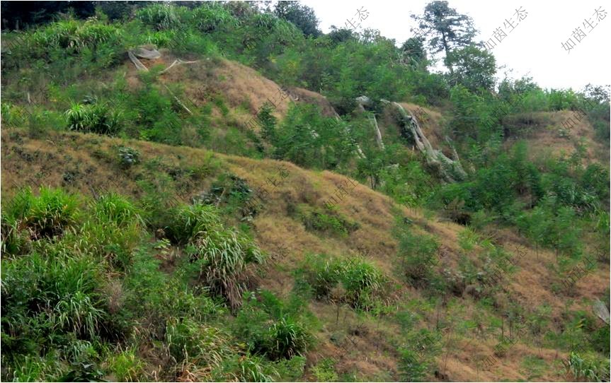 银山铅锌矿是一个有着50余年生产历史的多金属中型矿山,主要产闪锌矿、方铅矿、黄铜矿、黄铁矿等。本次工程内容主要是采坑顶边坡植被恢复。采坑边坡为砂岩、粘土岩等变质岩边坡,岩性为酸性流纹质集块角砾岩,裂隙发育明显,植被恢复技术难度较大。本次采用纤维丝固土护坡技术和原位改良技术,有效的恢复了边坡植被,效果明显。