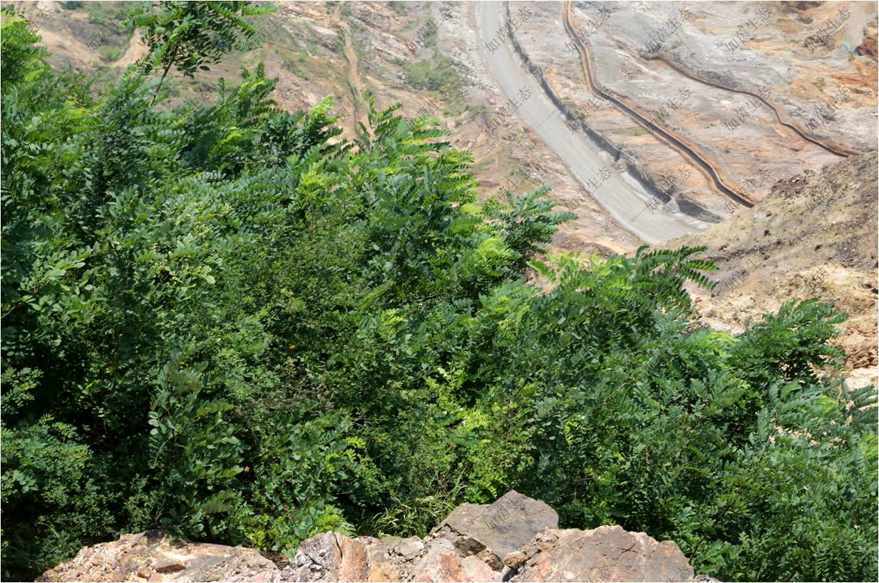 采坑矽卡岩边坡2600㎡样板工程,植被防护效果与周边尚未治理区域对比