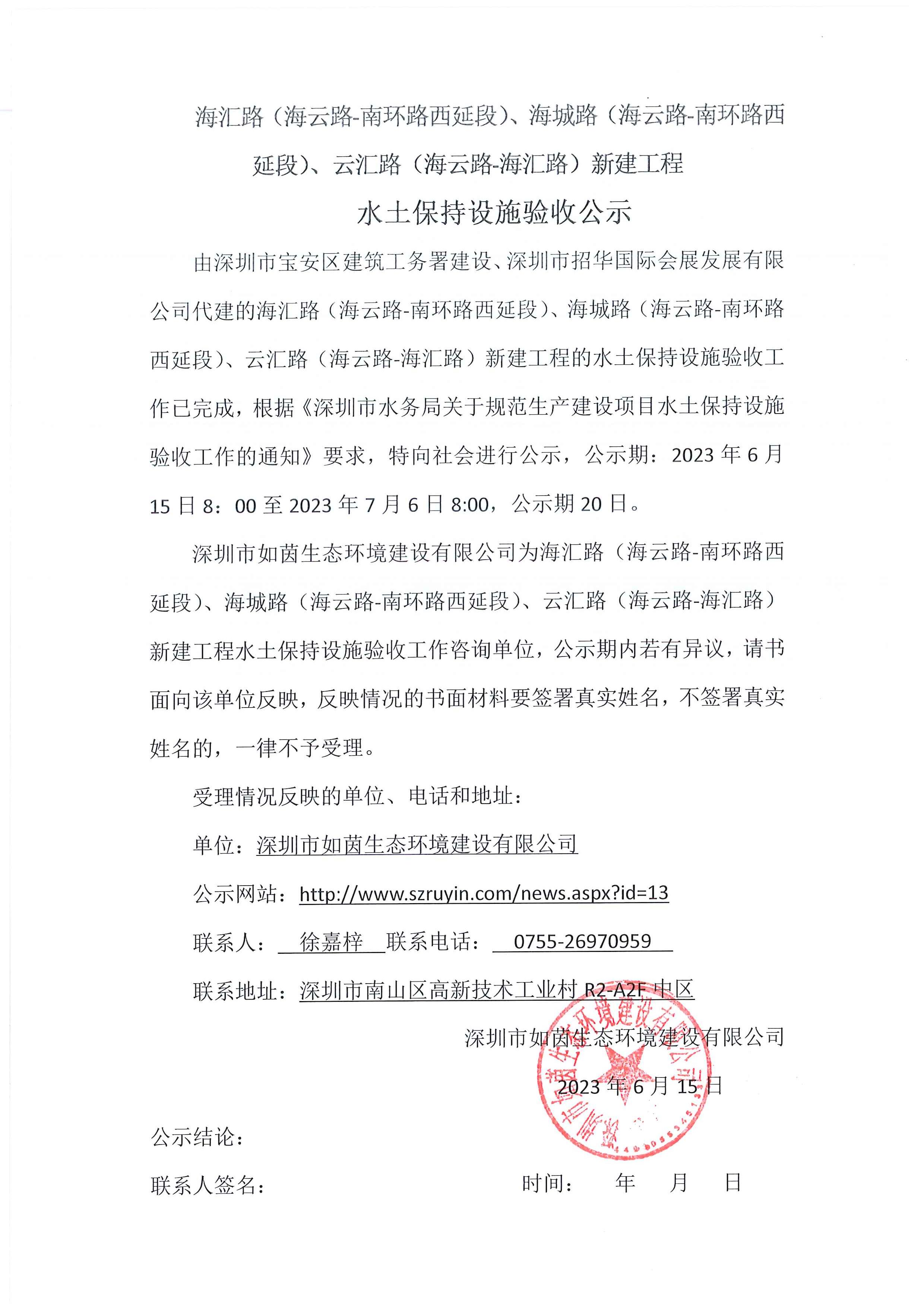 查看更多 >>由深圳市宝安区建筑工务署建设、深圳市招华国际会展发展有限公司代建的海汇路(海云路-南环路西延段)、海城路(海云路-南环路西延段)、云汇路(海云路-海汇路)新建工程的水土保持设施验收工作已完成,根...