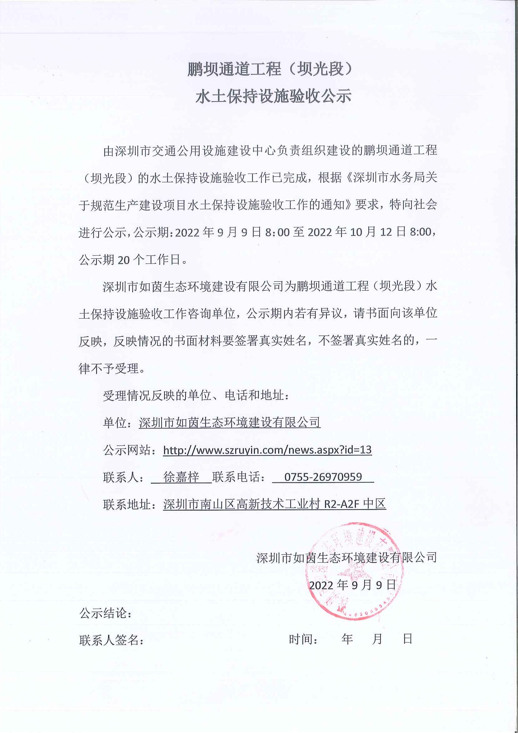 查看更多 >>由深圳市交通公用设施建设中心负责组织建设的鹏坝通道工程(坝光段)的水土保持设施验收工作已完成,根据《深圳市水务局关于规范生产建设项目水土保持设施验收工作的通知》要求,特向社会进行公示,公示...
