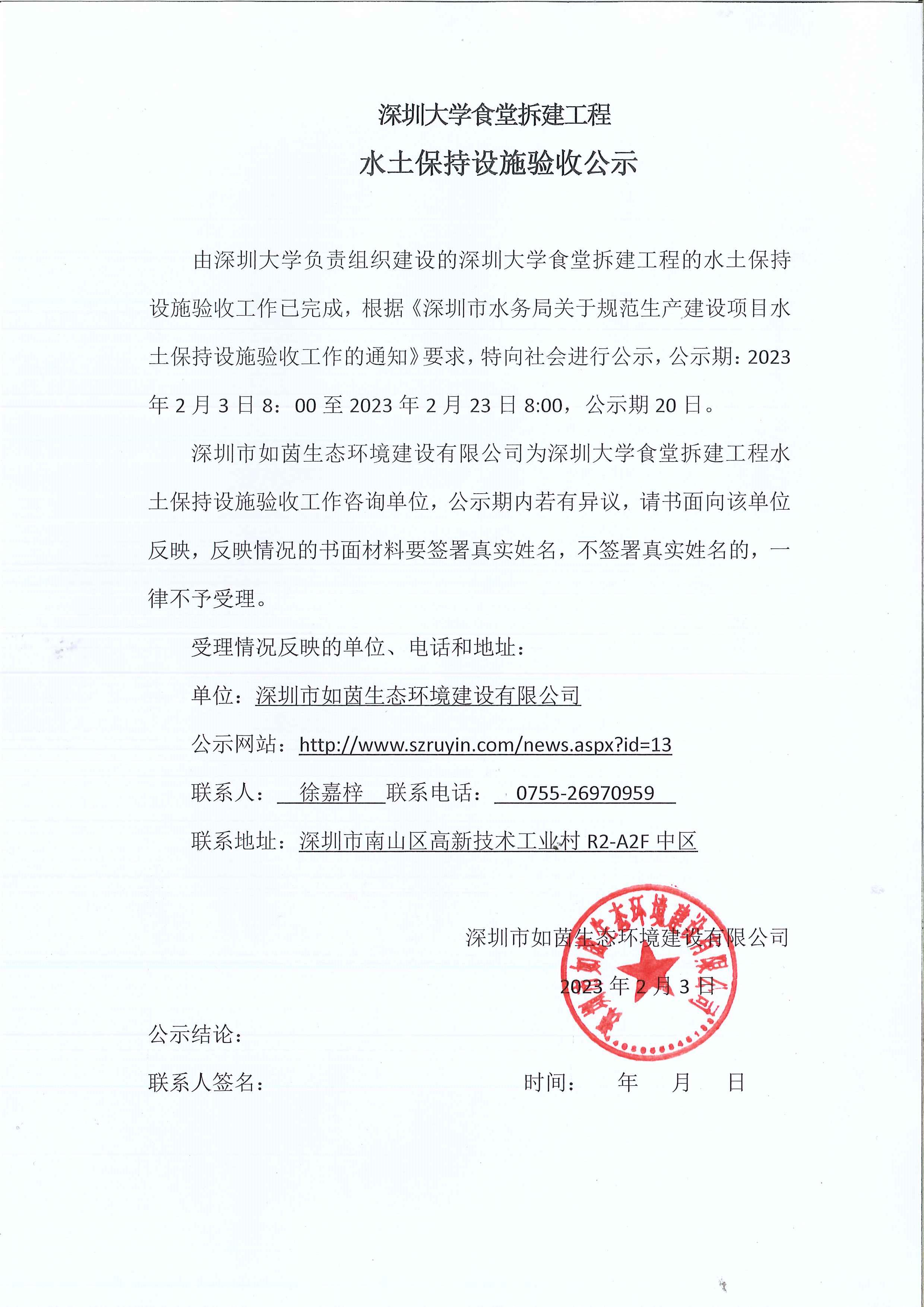查看更多 >>由深圳大学负责组织建设的深圳大学食堂拆建工程的水土保持设施验收工作已完成,根据《深圳市水务局关于规范生产建设项目水土保持设施验收工作的通知》要求,特向社会进行公示,公示期:2023年2月3日8:...