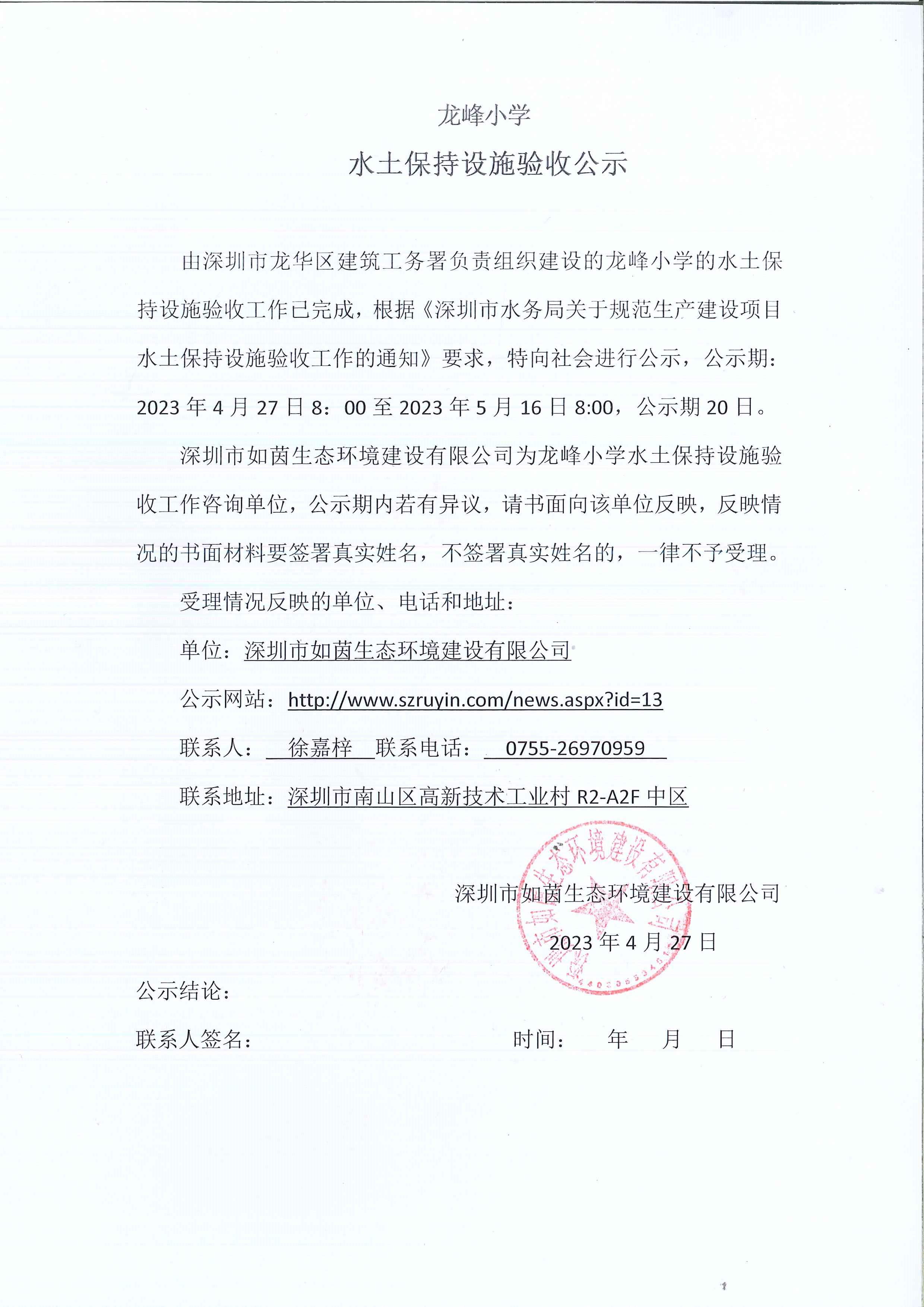 查看更多 >>由深圳市龙华区建筑工务署负责组织建设的龙峰小学的水土保持设施验收工作已完成,根据《深圳市水务局关于规范生产建设项目水土保持设施验收工作的通知》要求,特向社会进行公示,公示期:2023年4月27日...