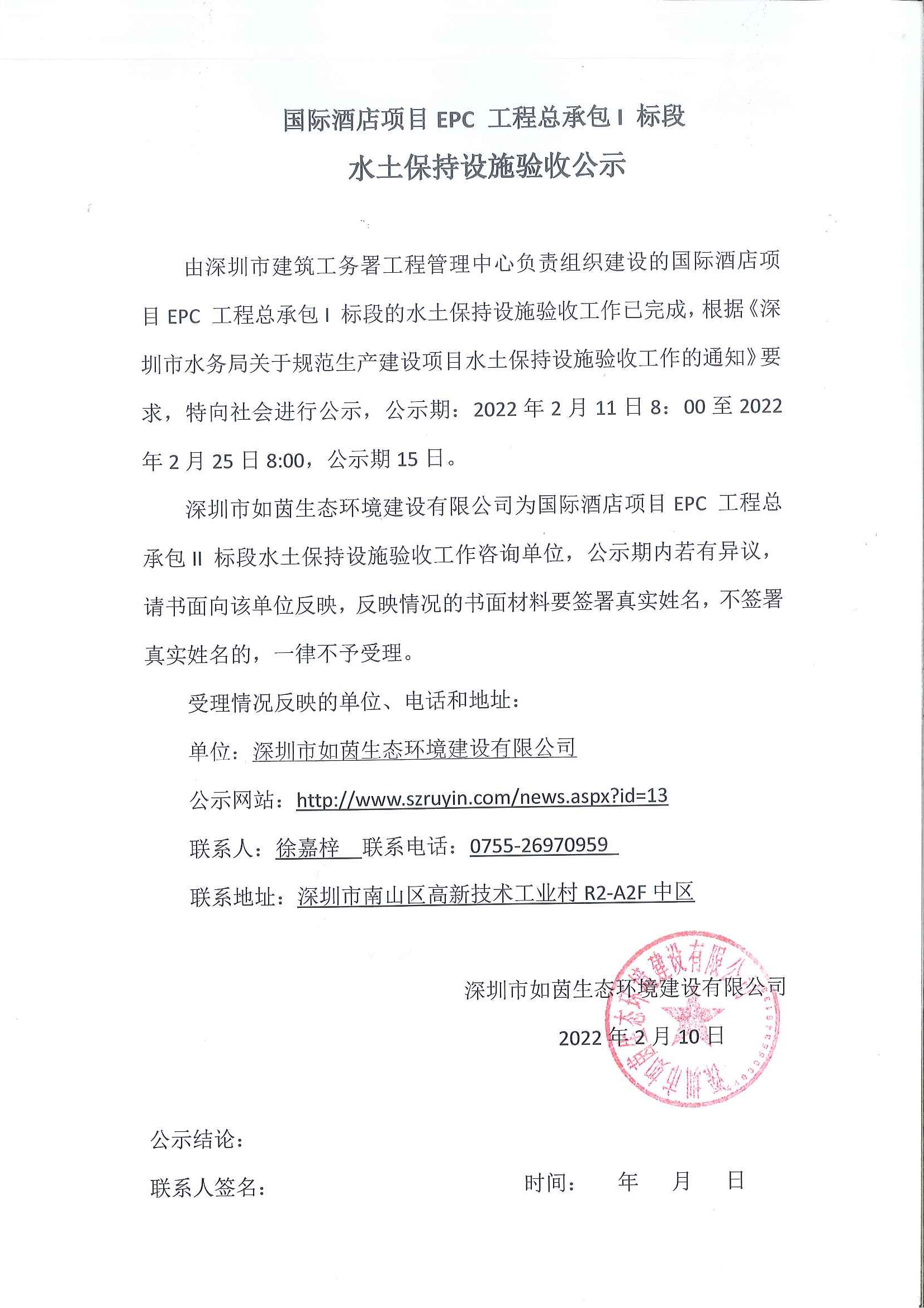 查看更多 >>由深圳市建筑工务署工程管理中心负责组织建设的国际酒店项目EPC 工程总承包I 标段的水土保持设施验收工作已完成,根据《深圳市水务局关于规范生产建设项目水土保持设施验收工作的通知》要求,特向社...