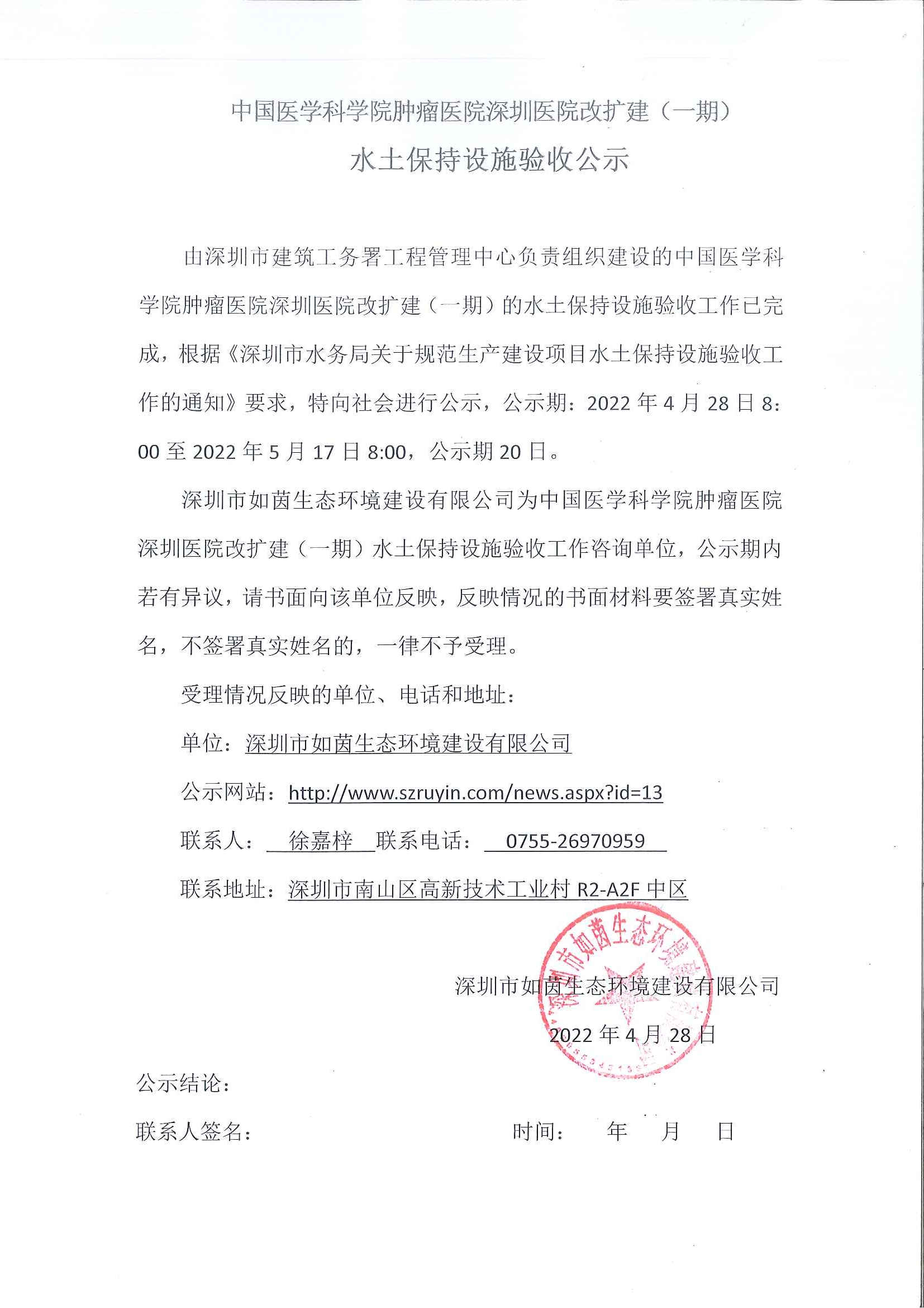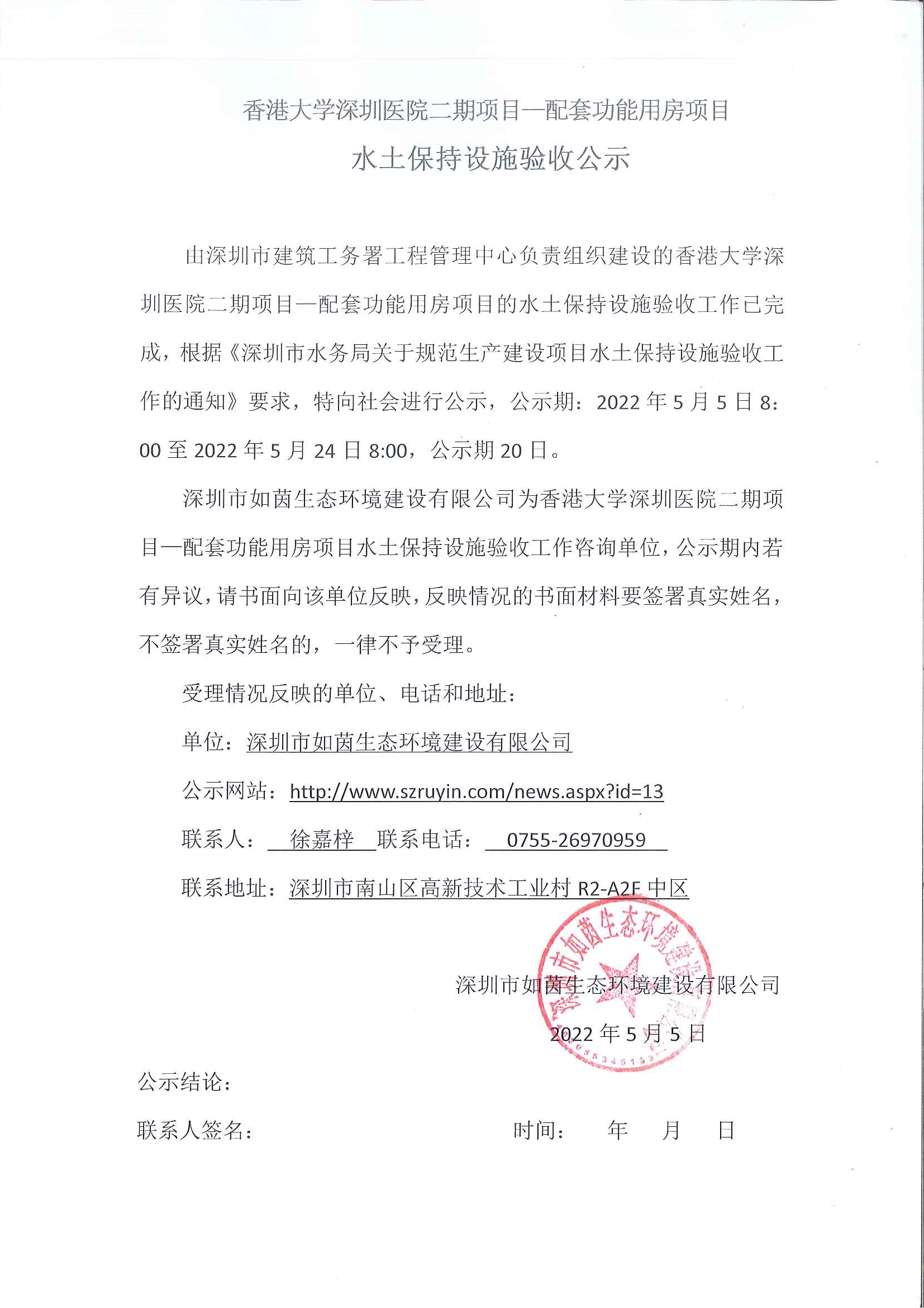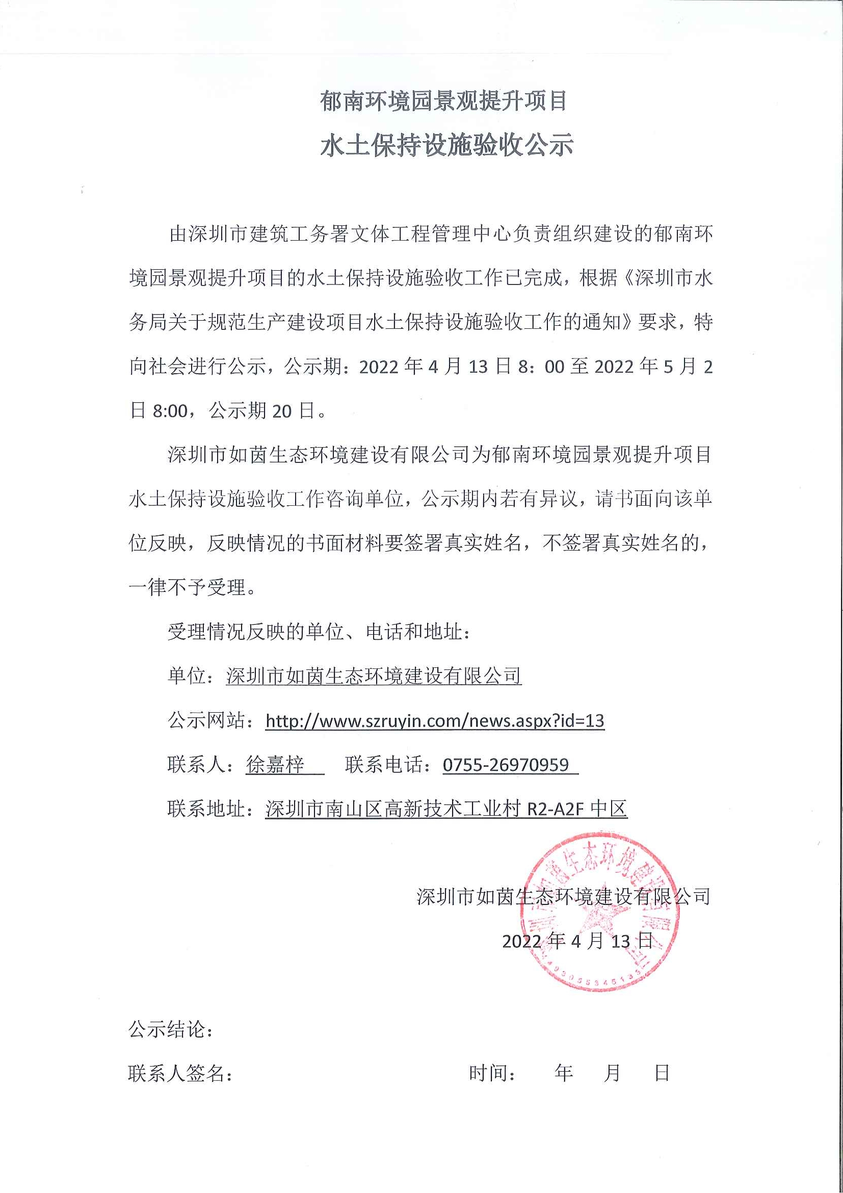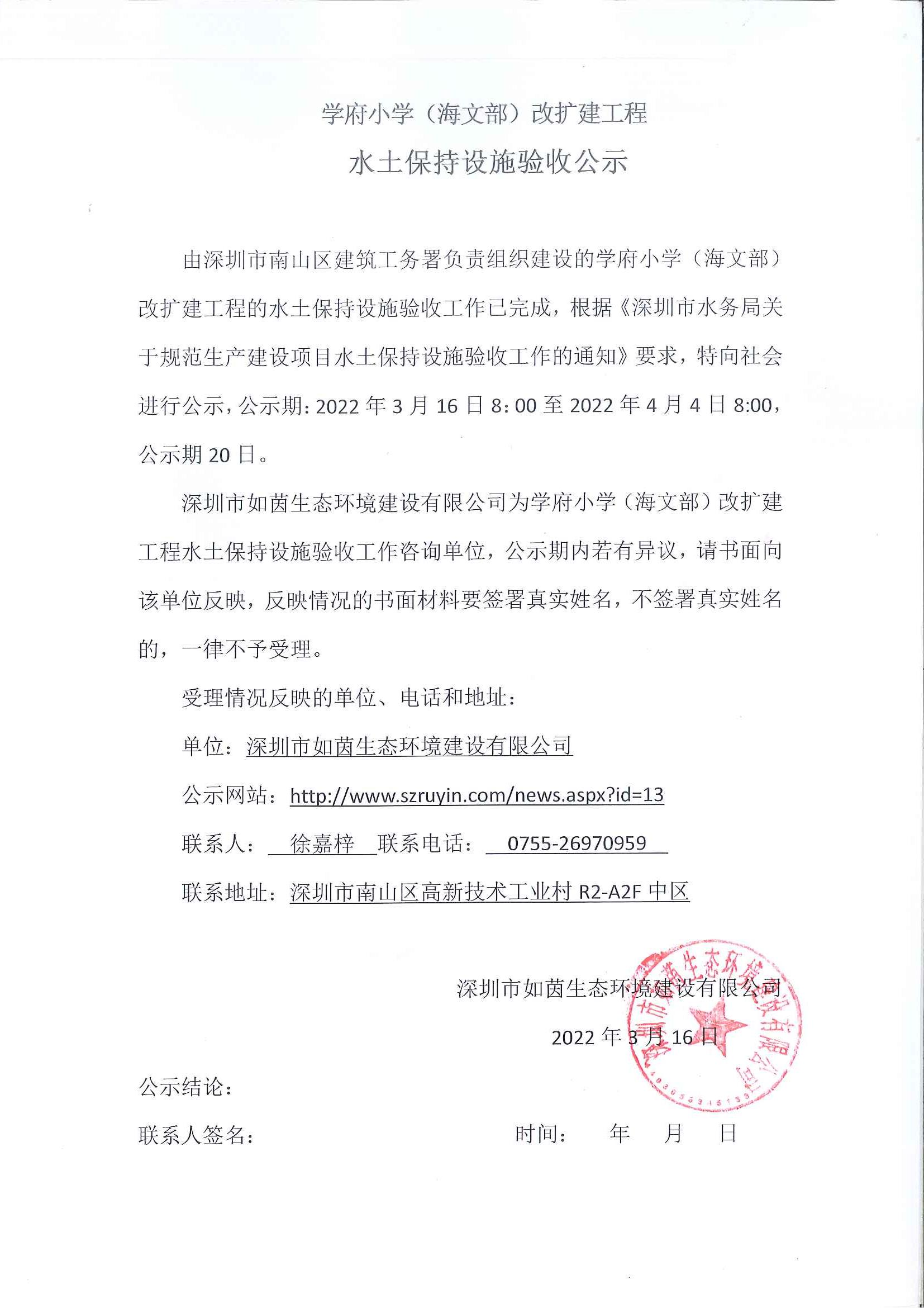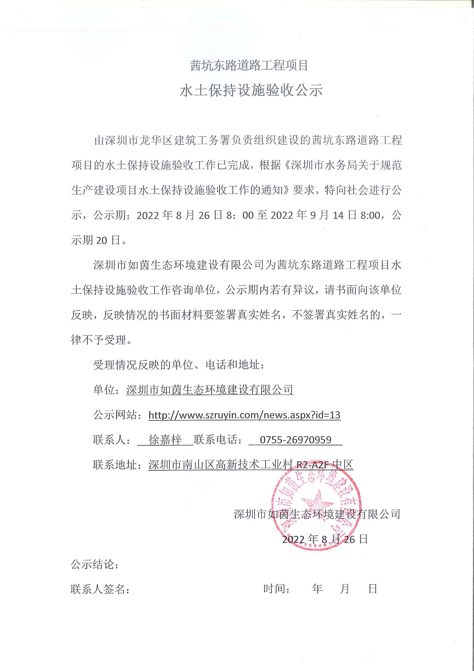 由深圳市龙华区建筑工务署负责组织建设的茜坑东路道路工程项目的水土保持设施验收工作已完成,根据《深圳市水务局关于规范生产建设项目水土保持设施验收工作的通知》要求,特向社会进行公示,公示期:...