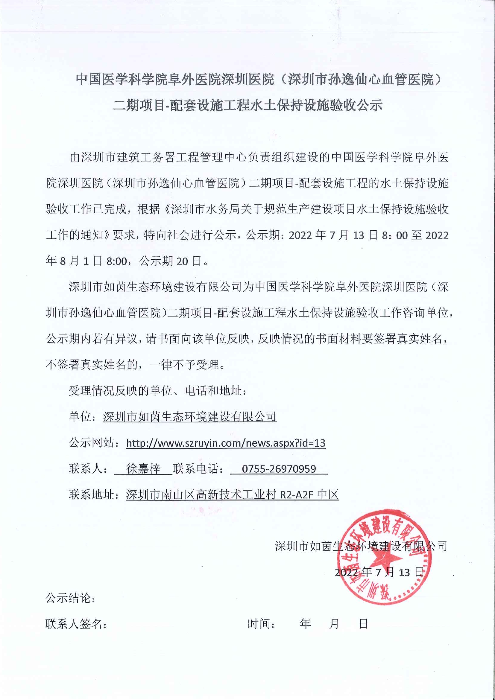 查看更多 >>由深圳市建筑工务署工程管理中心负责组织建设的中国医学科学院阜外医院深圳医院(深圳市孙逸仙心血管医院)二期项目-配套设施工程的水土保持设施验收工作已完成,根据《深圳市水务局关于规范生产建设...