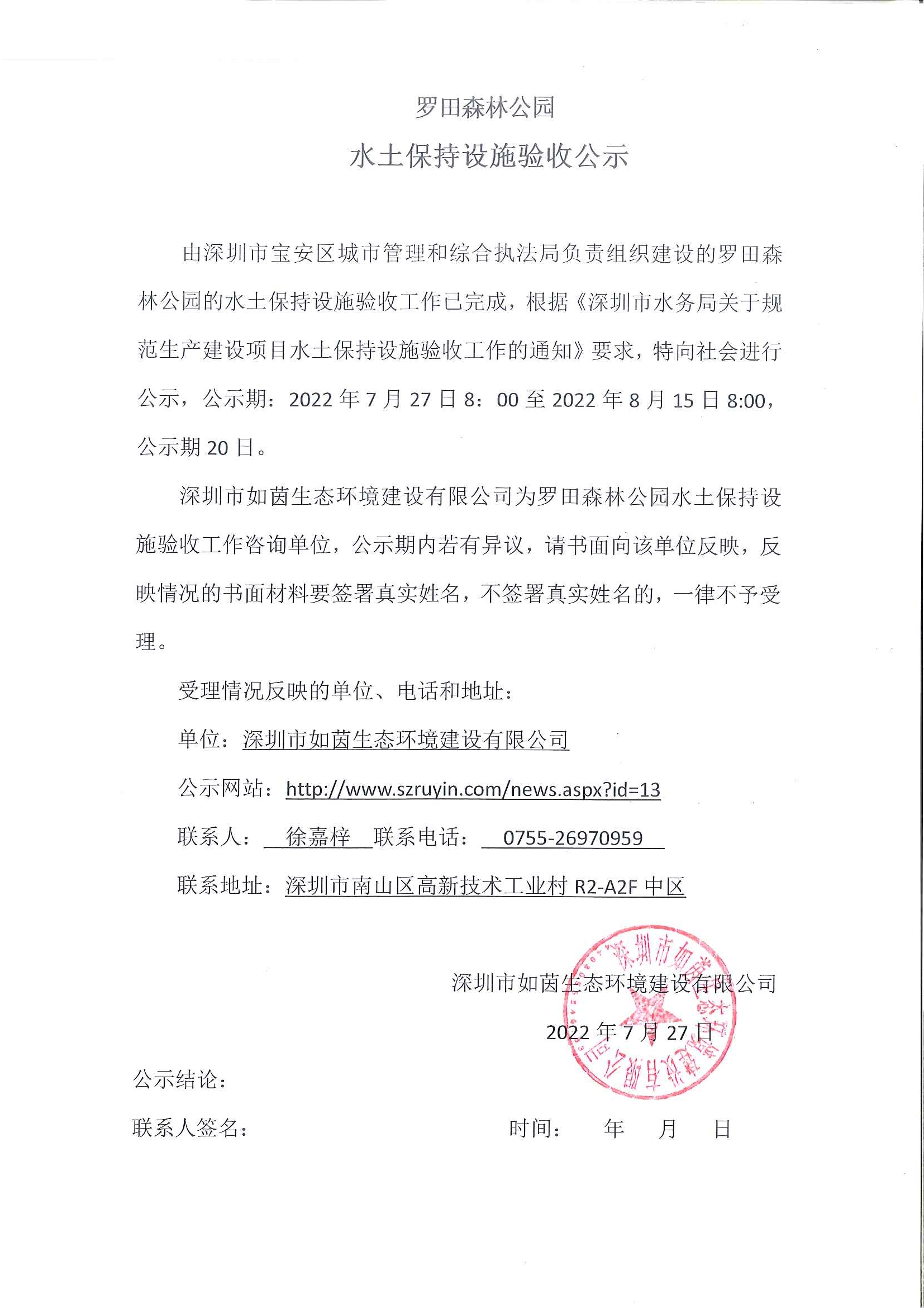 查看更多 >>由深圳市宝安区城市管理和综合执法局负责组织建设的罗田森林公园的水土保持设施验收工作已完成,根据《深圳市水务局关于规范生产建设项目水土保持设施验收工作的通知》要求,特向社会进行公示,公示期...