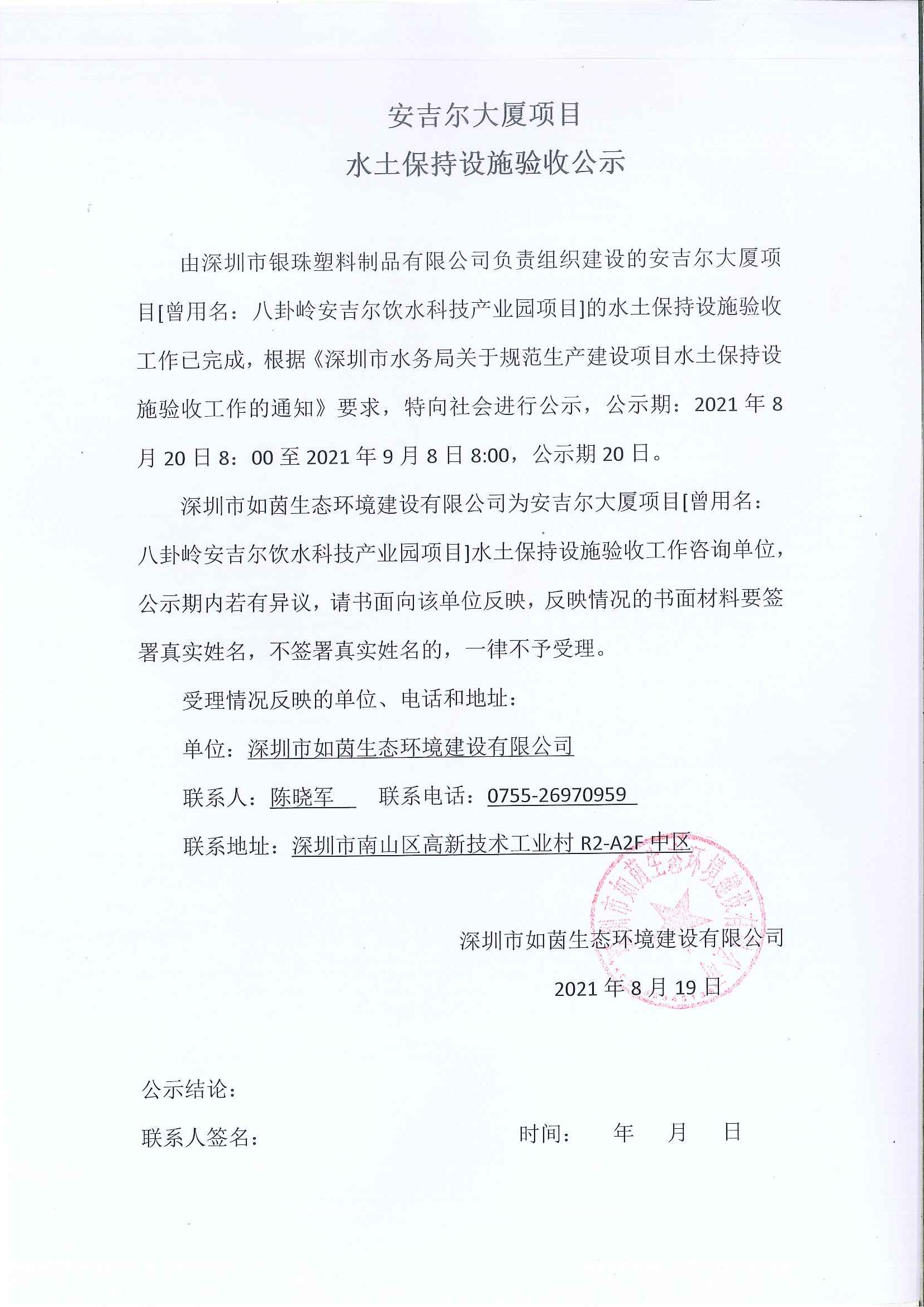 查看更多 >>由深圳市银珠塑料制品有限公司负责组织建设的安吉尔大厦项目[曾用名:八卦岭安吉尔饮水科技产业园项目]的水土保持设施验收工作已完成,根据《深圳市水务局关于规范生产建设项目水土保持设施验收工作...