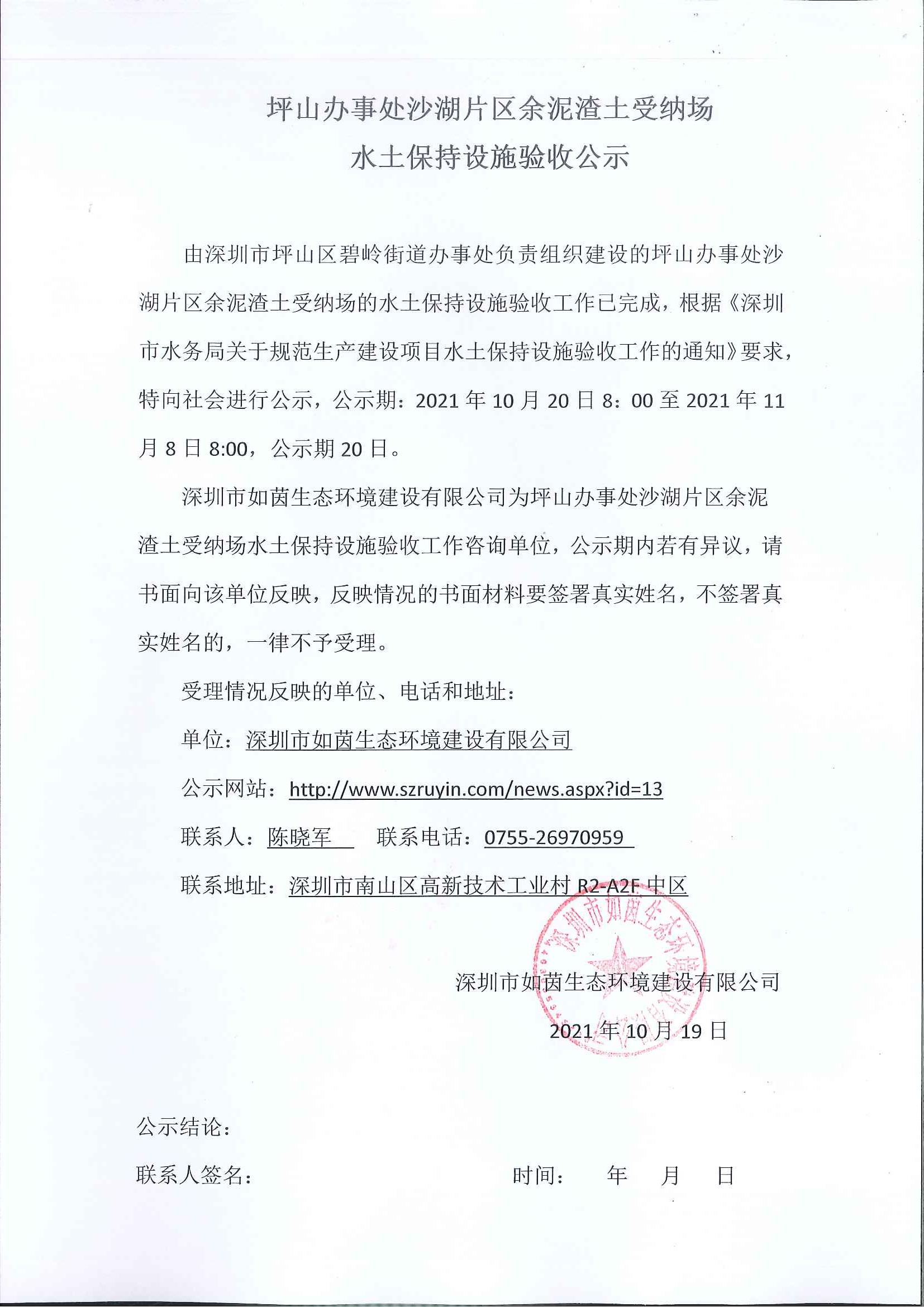 查看更多 >>由深圳市坪山区碧岭街道办事处负责组织建设的坪山办事处沙湖片区余泥渣土受纳场的水土保持设施验收工作已完成,根据《深圳市水务局关于规范生产建设项目水土保持设施验收工作的通知》要求,特向社会...