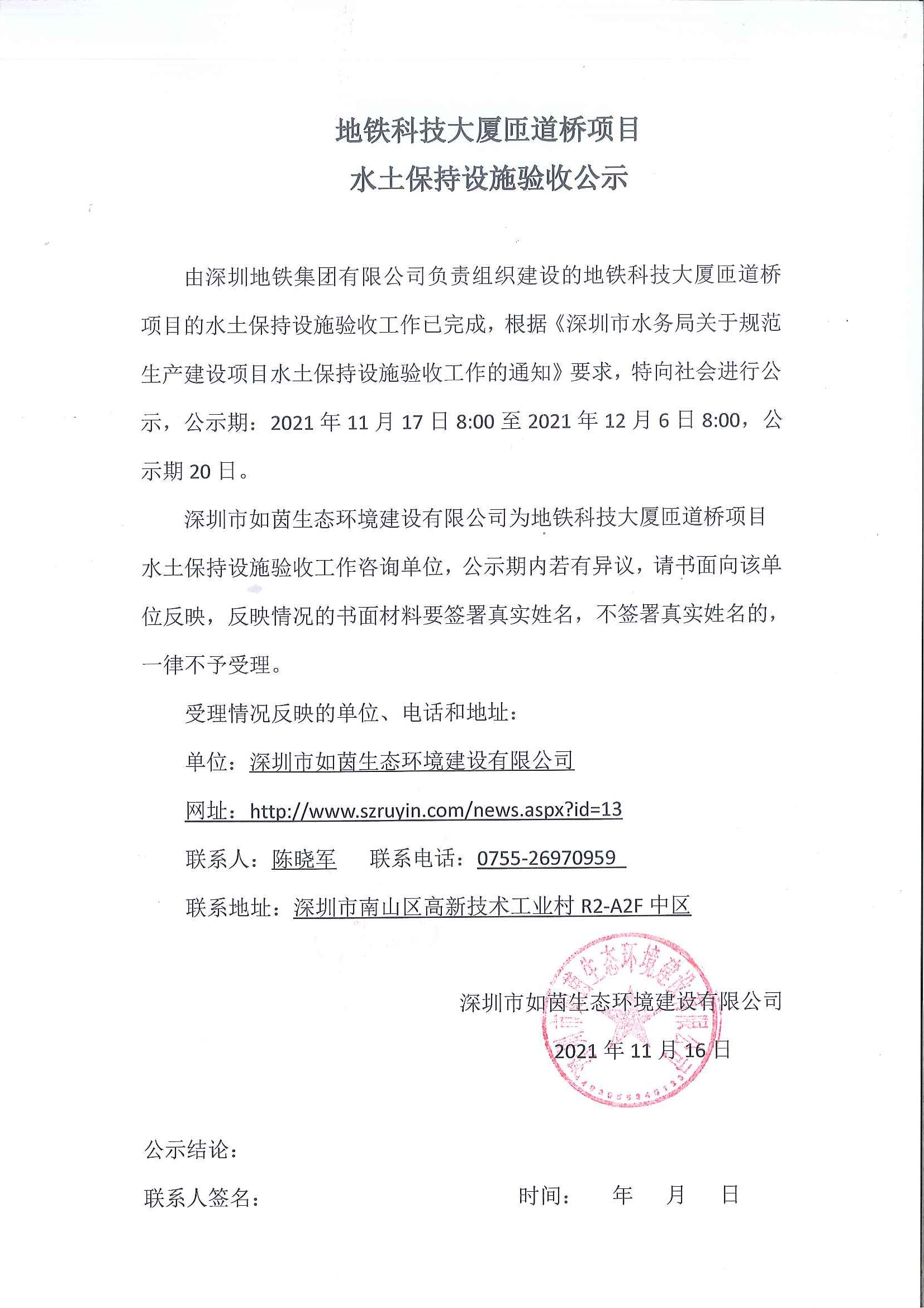 查看更多 >>由深圳地铁集团有限公司负责组织建设的地铁科技大厦匝道桥项目的水土保持设施验收工作已完成,根据《深圳市水务局关于规范生产建设项目水土保持设施验收工作的通知》要求,特向社会进行公示,公示期:...