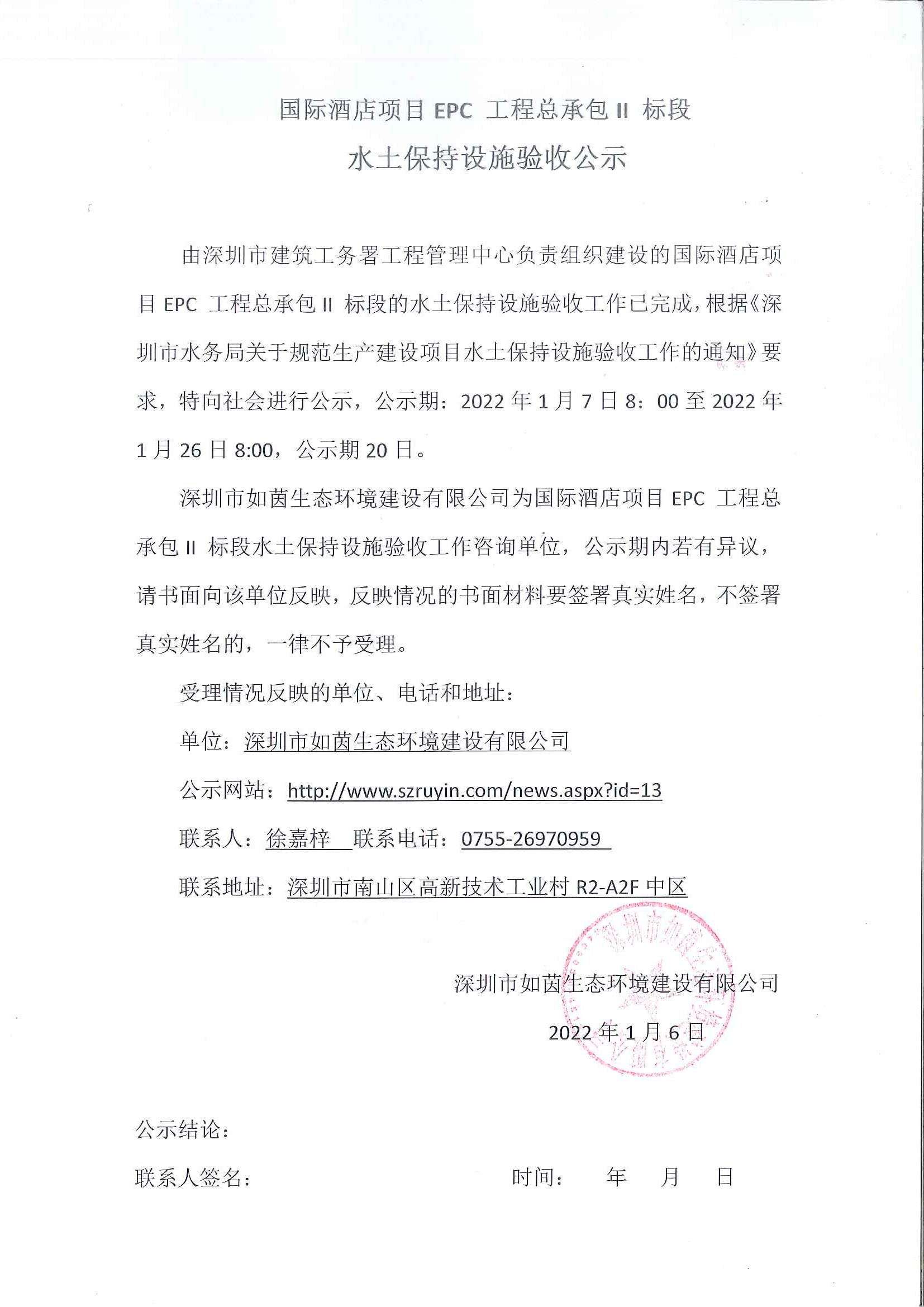 由深圳市建筑工务署工程管理中心负责组织建设的国际酒店项目EPC 工程总承包II 标段的水土保持设施验收工作已完成,根据《深圳市水务局关于规范生产建设项目水土保持设施验收工作的通知》要求,特向社...